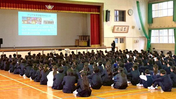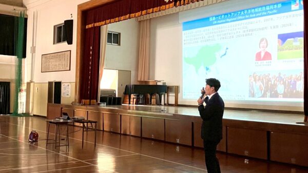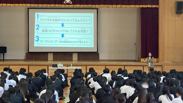 小学生、中学生のみなさんが日頃から勉強しているSDGsの目標達成に向けた取り組みと、来年福岡市で第15回が開催されるアジア太平洋都市サミットや、国連ハビタットの活動を結びつけながらお話ししました。